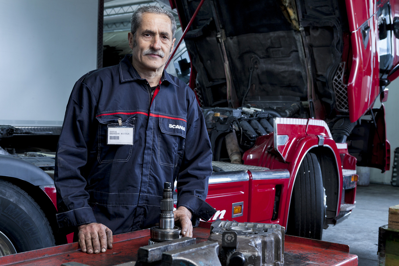 Un meccanico delle Officine Spolzino ad Athena Lucana (PZ) fotografato per il brand magazine “Legend” della Scania (2014)