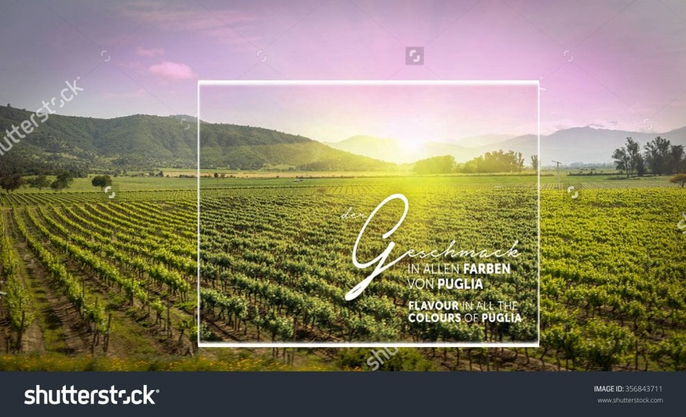 La foto dell’Archivo Shutterstock. Nel riquadro la porzione utilizzata per la promozione della Regione Puglia alla Fiera Di Dusseldorf che precede di poco il Vinitaly