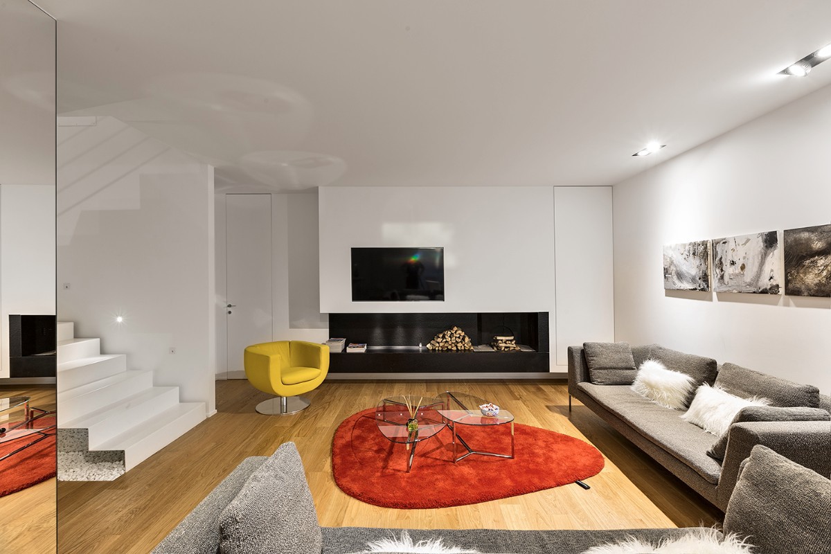 La scelta della combinazione dei colori (la “palette”, cioè la tavolozza) è un momento fondamentale di qualsiasi progetto visivo (che riguardi grafica, moda, fotografia, cinematografia, arredamento). Nel nostro lavoro di fotografi di interni ci rendiamo conto di quanto la scelta e l’abbinamento dei colori stabilisca il carattere, la personalità di un ambiente. Ad esempio nel living room qui sotto, gli unici elementi di colore deciso inseriti dal progettista (l’architetto Antonella Laruccia) sono il tappeto e la poltroncina, che creano una tensione tra di loro, circondati da elementi neutri (pareti bianche) o con colori tenui (parquet).