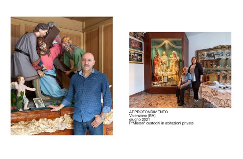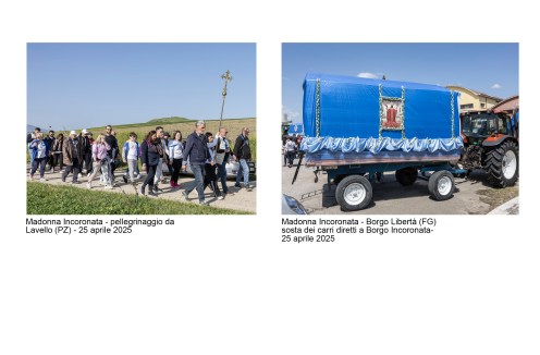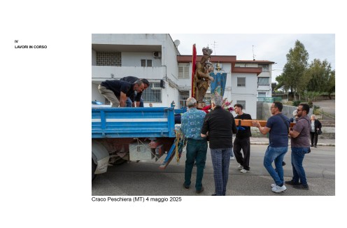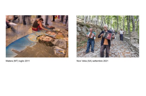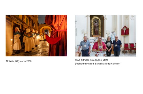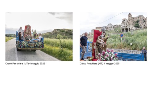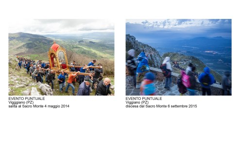 E’ un percorso attraverso riti e luoghi mariani della Basilicata, partito come sempre da una esperienza diretta: la scoperta dei pellegrinaggi che seguono il simulacro della Vergine negli spostamenti dal paese al Santuario e viceversa. Il primo pellegrinaggio che abbiamo documentato è stato, nel 2013, quello della salita al Sacro Monte della statua raffigurante la Madonna di Viggiano (PZ). Fotografare un pellegrinaggio di questo tipo è una esperienza “totale” che coinvolge gambe, cuore, occhi, per rendere, con il linguaggio che abbiamo a disposizione, la situazione di fede e bellezza in cui ci troviamo immersi. La nostra ricerca è poi proseguita con la documentazione di altri pellegrinaggi, luoghi di culto (Santuari, edicole votive) e oggetti d’arte (statue, dipinti, ex-voto)