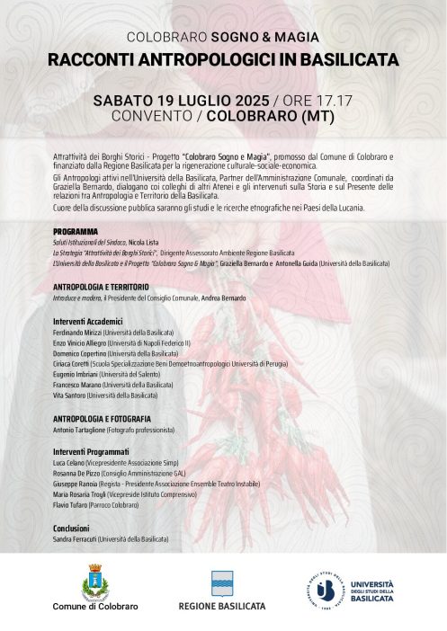 “Presso il Convento di Colobraro sabato 19 luglio 2025 alle ore 17.17 ( orario ideale per i più scaramantici), gli Antropologi attivi nell’Università della Basilicata, coordinati da Graziella Bernardi, dialogheranno con i colleghi provenienti da altri Atenei da varie parti della Penisola, sul rapporto tra Antropologia e il Territorio della Basilicata. Chi più di Colobraro, teatro di “Sogno di una notte a Quel Paese”, poteva ospitare la riflessione sul legame tra folclore e società? Modererà il dialogo tra i tecnici del settore, le istituzioni e i cittadini il Presidente del Consiglio Comunale, Andrea Bernardo.Si parlerà dell’importanza da dare ai nostri borghi storici, e delle ricerche etnografiche nei Paesi della Lucania.” (da “Il Metapontino” del 15 luglio 2025)
