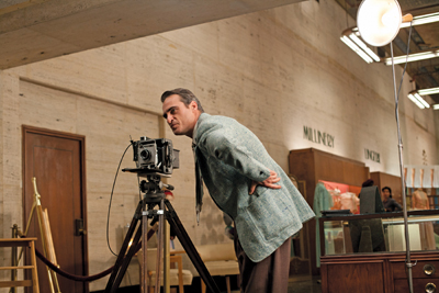 Freddie Quell usa la Crown Graphic 4″ x 5″ di Malamaire… in alto a destra un Photoflood, tipica lampada da studio del periodo