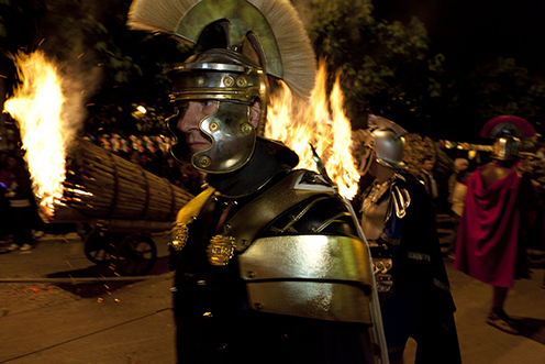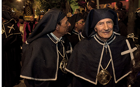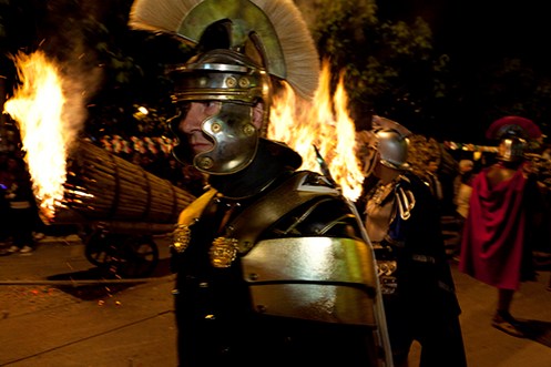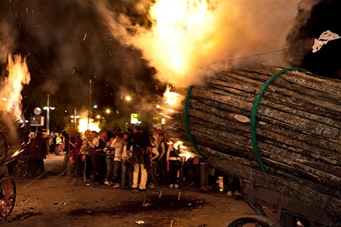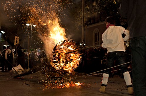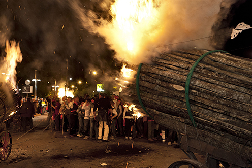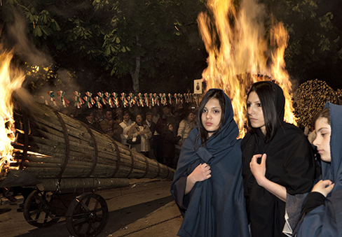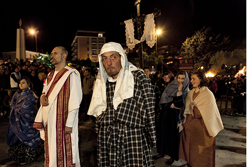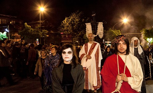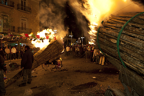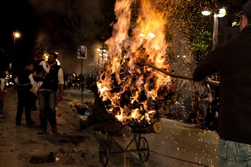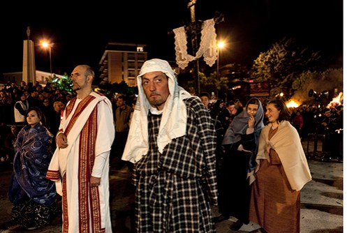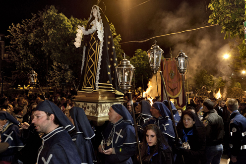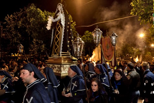“Sulla data di nascita delle fracchie non c’è uniformità di vedute tra gli studiosi: secondo alcuni la tradizione potrebbe farsi risalire tra la seconda metà del Settecento e la prima dell’Ottocento, sebbene le prime descrizioni scritte siano dell’inizio del nostro secolo. Certo è che nascono per accompagnare la processione dell’Addolorata, il giovedì Santo, e che poi – nel corso dei decenni – vengono spostate al venerdì. Anche la funzione stessa delle fracchie e dibattuta: c’è infatti chi lega la tradizione al cristianesimo, e quindi alla leggenda cristiana che fa accompagnare il Salvatore da una fiaccolata lungo la via del Getsemani; altri preferiscono più “paganamente” legarle all’esigenza di illuminare le vie dell’antico borgo, sprovvisto addirittura anche di fanali. I contadini avrebbero quindi pensato di scortare la statua dell’Addolorata dalla chiesa omonima alla Collegiata col bagliore delle rosseggianti fiammate delle fracchie. Il termine sammarchese “fracchia” è di incerta etimologia. Potrebbe derivare dal latino facula, e quindi da fiaccola, trasformato poi dagli abruzzesi in farchia o fracchje. Questa ricostruzione trova riscontro anche dal fatto che in Abruzzo esistono fiaccole molto simili a quelle sammarchesi. Ma cosa sono le fracchie? come vengono costruite? Si tratta di grandi torce di dimensioni diverse (arrivano fino a 5-6 metri di lunghezza) costruite da un tronco spaccato longitudinalmente e riempito di rami, sterpi, schegge di legno e frasche, fino a costituire un falò di forma conica, che finisce – nella estremità più stretta – con un braccio sporgente. La fracchia così ottenuta viene trasportata su appositi carrelli. Il tutto è tenuto insieme da due grandi cerchi di ferro, e viene intriso di sostanze infiammabili. La fracchia si accende dalla parte più larga e, per evitare che non cada in avanti o scivoli sul carrello, viene appesantita con una zavorra di sacchi di sabbia nella parte posteriore. Sempre nella parte posteriore è completata da un palo, portante in cima l’immagine della Madonna Addolorata.” Quotidiano “ROMA” sabato 10 aprile 1993 pag. 21 (FOGGIA)