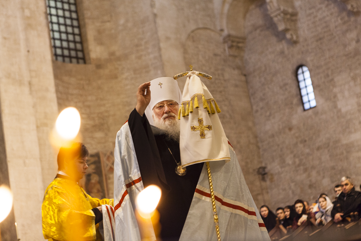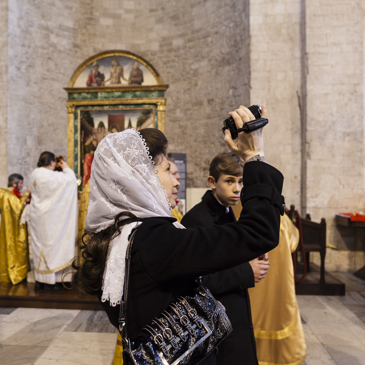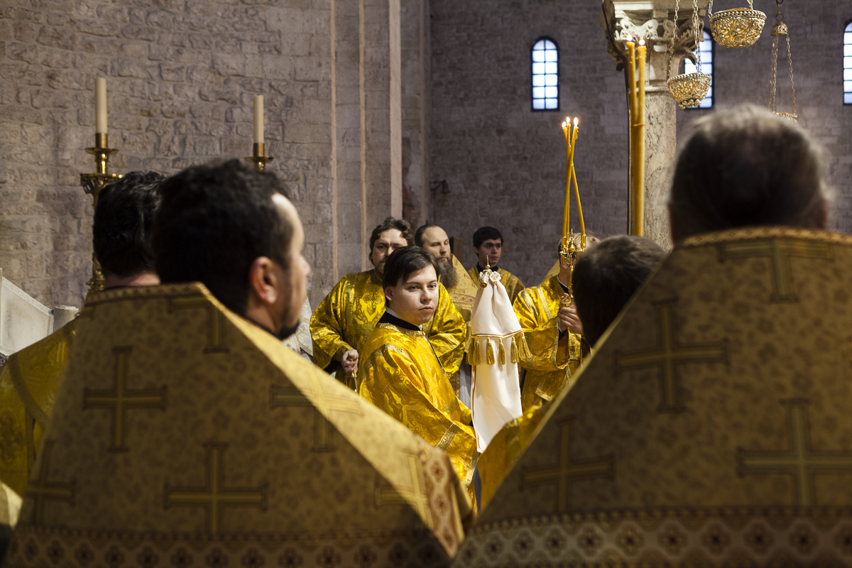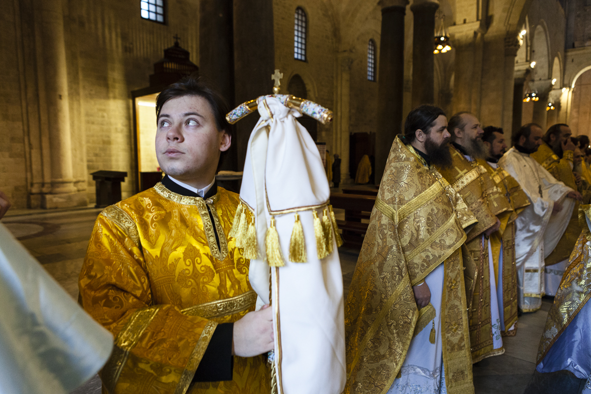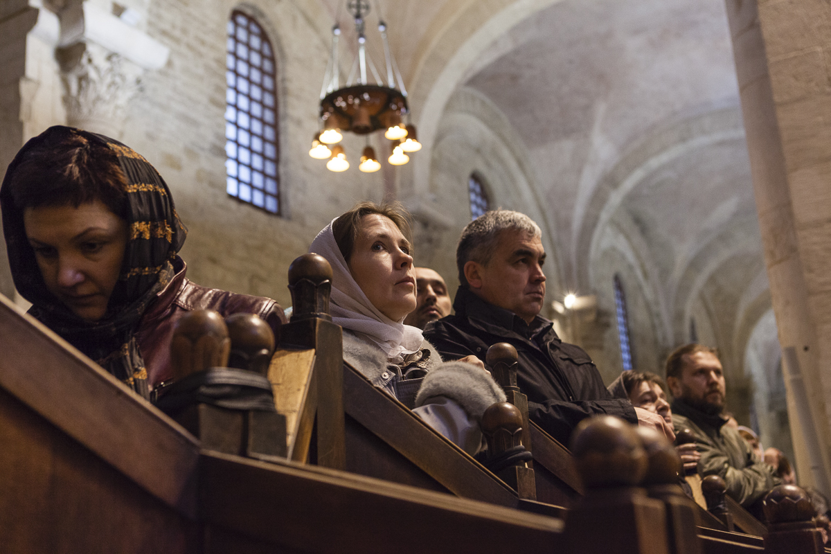 – Zoya viene dalla Siberia. Nella sua Kemerovo, dove il termometro segna meno trenta gradi, durante il regime sovietico tutte le chiese furono chiuse. Tranne una. Quella di San Nicola di cui Zoya, oggi, è una sorta di tesoriera. «Sognavo sin da piccola di potere venire a Bari in pellegrinaggio. Non si può descrivere quello che provo in questo momento». Zoya è solo una dei quattromila fedeli che in questi giorni sono in città per festeggiare e onorare la ricorrenza liturgica ortodossa di San Nicola, secondo calendario giuliano, tredici giorni dopo quella del 6 dicembre, come previsto, invece, da calendario della Chiesa cattolica. In attesa della celebrazione prevista per oggi, nella Basilica del santo patrono, centinaia di pellegrini si sono riversati nella chiesa russa. Decine i pullman pieni di fedeli che accostano in corso Benedetto Croce. La polizia municipale ha il suo gran da fare per fare rispettare il divieto di sosta davanti alla chiesa. Arrivano, si inginocchiano, fanno il segno della croce secondo le modalità ortodosse, salgono verso l’altare mentre nel cortile su un maxischermo viene proiettato ciò che accade all’interno. «Noi ortodossi – spiega Natasha, ucraina che da anni vive a Napoli e che parla un ottimo italiano – facciamo il segno della croce con tre dita, pollice, indice e medio che rappresentano la Trinità. Le altre due dita rappresentano la dualità, umano e divino, che si fondono in Dio». Le donne hanno tutte il capo coperto con un velo e non indossano pantaloni. Si assiste alla cerimonia in piedi o in ginocchio, nessuno è seduto. Su di un lato un sacerdote amministra il sacramento della confessione coprendo il capo del fedele con un velo. «Confessarsi a Bari – si lascia sfuggire un fedele che è per la seconda volta in pellegrinaggio in città – ha un sapore diverso. Voi non avete idea dell’importanza che San Nicola ha per noi e della fortuna che avete ad ospitare le sue sacre spoglie». Mentre la funzione religiosa va avanti, c’è chi si avvicina a due banchetti allestiti là dove, sino a qualche anno fa, c’era l’ingresso della sede della circoscrizione. Si acquistano oggetti sacri e candele («sono naturali e fatte con la cera delle api», ci spiegano); si compilano delle liste con dei nomi. Un blocchetto è riservato ai defunti. Un altro ai vivi. Il pellegrino che arriva compila i due fogli indicando i nomi delle persone care per cui chiede di pregare. Oggi, le decine di sacerdoti che prenderanno parte alla cerimonia in Basilica, tra cui Andrej Boytsov il rettore della chiesa russa, leggeranno in silenzio quei nomi. Pregheranno per loro. «Prima di partire – dice Irina, di Mosca – vicini di casa e parenti mi hanno consegnato le liste con i loro nomi». Vengono da Russia, Ucraina, Georgia, Bielorussa, Moldova. In aereo o pullman. «Per almeno una volta nella vita – spiegano – bisogna venire a Bari per onorare San Nicola».