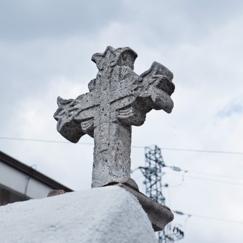 la croce franco-provenzale di Celle, restaurata di recente… sullo sfondo l’elettrodotto che passa vicino al paese.